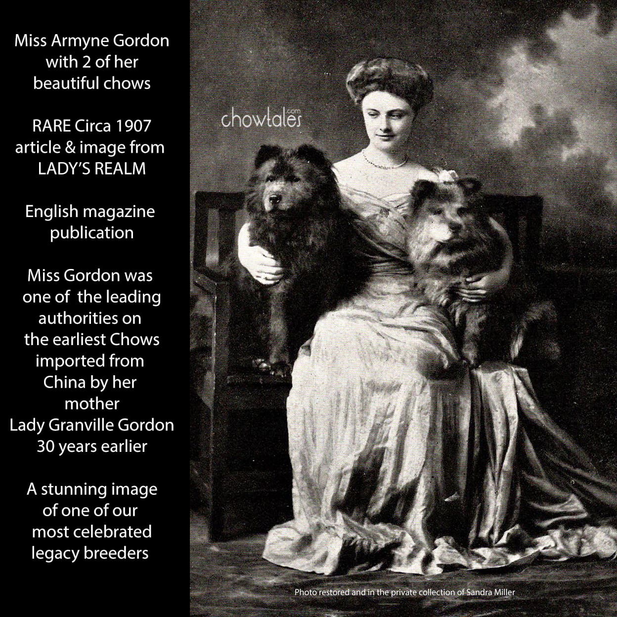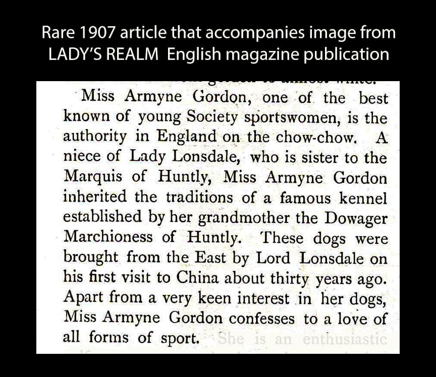 The little writeup below went with this stunning photograph of Miss Armyne Gordon, one of the leading authorities on the earliest Chows imported from China by her mother, Lady Granville Gordon. This is the most breathtaking image I have found so far of Miss Gordon with her chows. The article was worth every penny I paid to purchase it from England just to obtain this image!