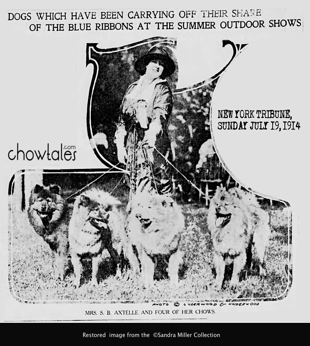 Below is another clipping from the same time frame of Mrs. Axtell with a string of her chows. These are both dated 1914 and Mrs Axtell is wearing the same outfit so my guess is both photos may have been taken at the same show circuit.