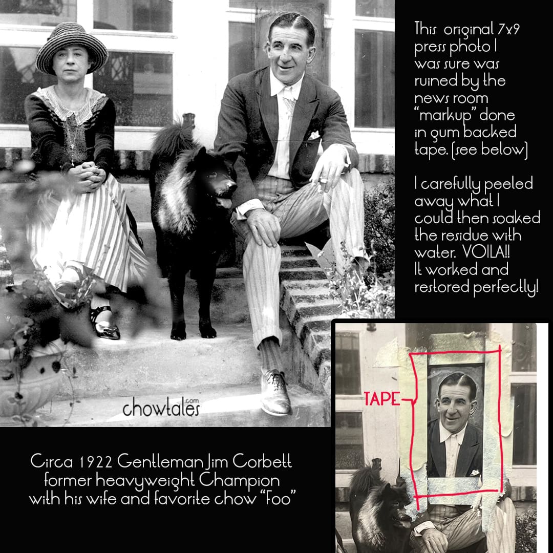 I did the best I could to bring out the image of the chow “Foo” but the original newsclipping was too damaged. You can make out the dog faintly to the left of James Corbett. I’m so glad I was able to find the first photo which is just beautiful of the entire family.