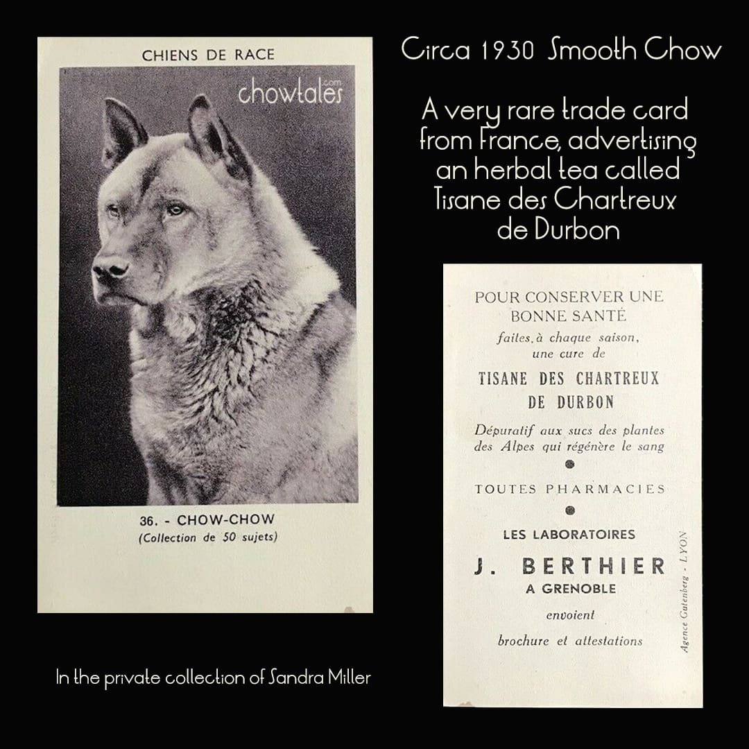 This is such an unusual trade card I simply had to have it for the ChowTales archives . I was actually surprised no one else was bidding on this unique piece of smooth chow ephemera (my lucky day) !! The chow in this photo reminds me SO much of the smooth chow pictured below from the same decade owned by Princess Poutiatine. A very distinctive headtype and expression.