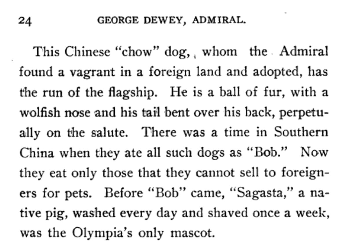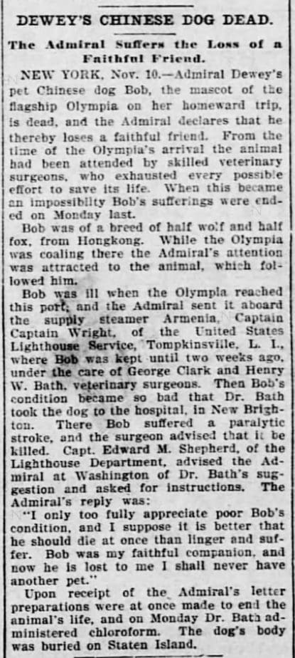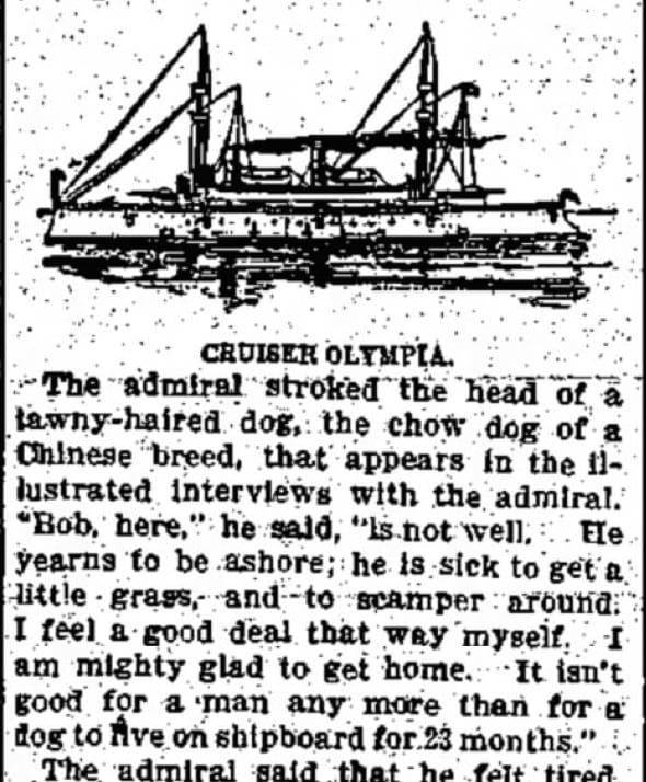 As for the end of Bobs life, there are a couple of different versions I’ve found with variations on each. My guess is that both are true when combined into one story. The abuse this faithful little chow took from the crew aboard the Olympia surely led to severe injuries which could not be repaired. I am so glad I discovered these photos and stories as I want “Bob” to always be remembered for the loyal companion he was to the Admiral. Dewey’s history I vaguely remembered from history class but learning about this precious dog really made the story sink in.