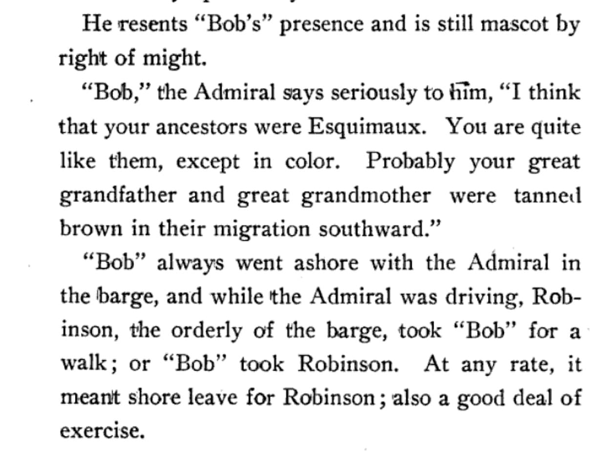 Admiral Dewey had on board Olympia as his pet a badly spoiled dog. He was very fond of it and in his eyes it could do no wrong; however he was alone in that opinion and both officers and the crew, particularly the afterguard sweepers, detested the animal. The dog was smart enough to know that his enough to know that his sole protector was the Admiral and ran back to him if he had been maltreated, whenever anyone touched or made a pass in his general direction.