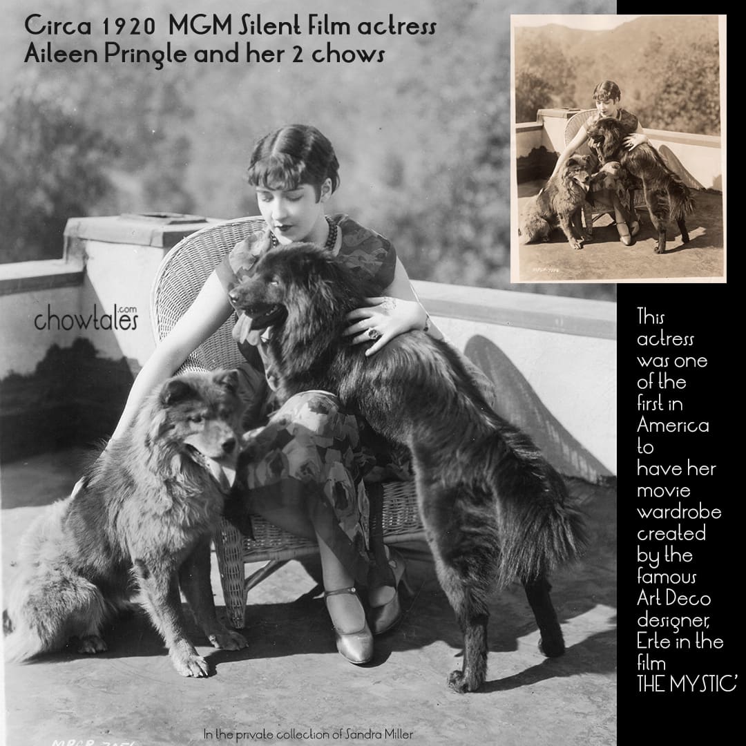 This image is one of the most treasured in my private collection because it represents so many facets of my love of chows, art, and history and the silent film era. When I saw this original 8×10 Metro Goldwyn Mayer publicity photo was available I knew exactly who the silent film actress was as well as her connection to one of my favorite artists and designers, Erte’. Erte’ designed Aileen Pringles’ costumes for the silent film The Mystic 1925. You can find the movie HERE if you would like to see Aileen and her amazing wardrobe in action. I certainly have!!! I HAD to have this photo and am so glad the bidding didn’t get too out of control!!!