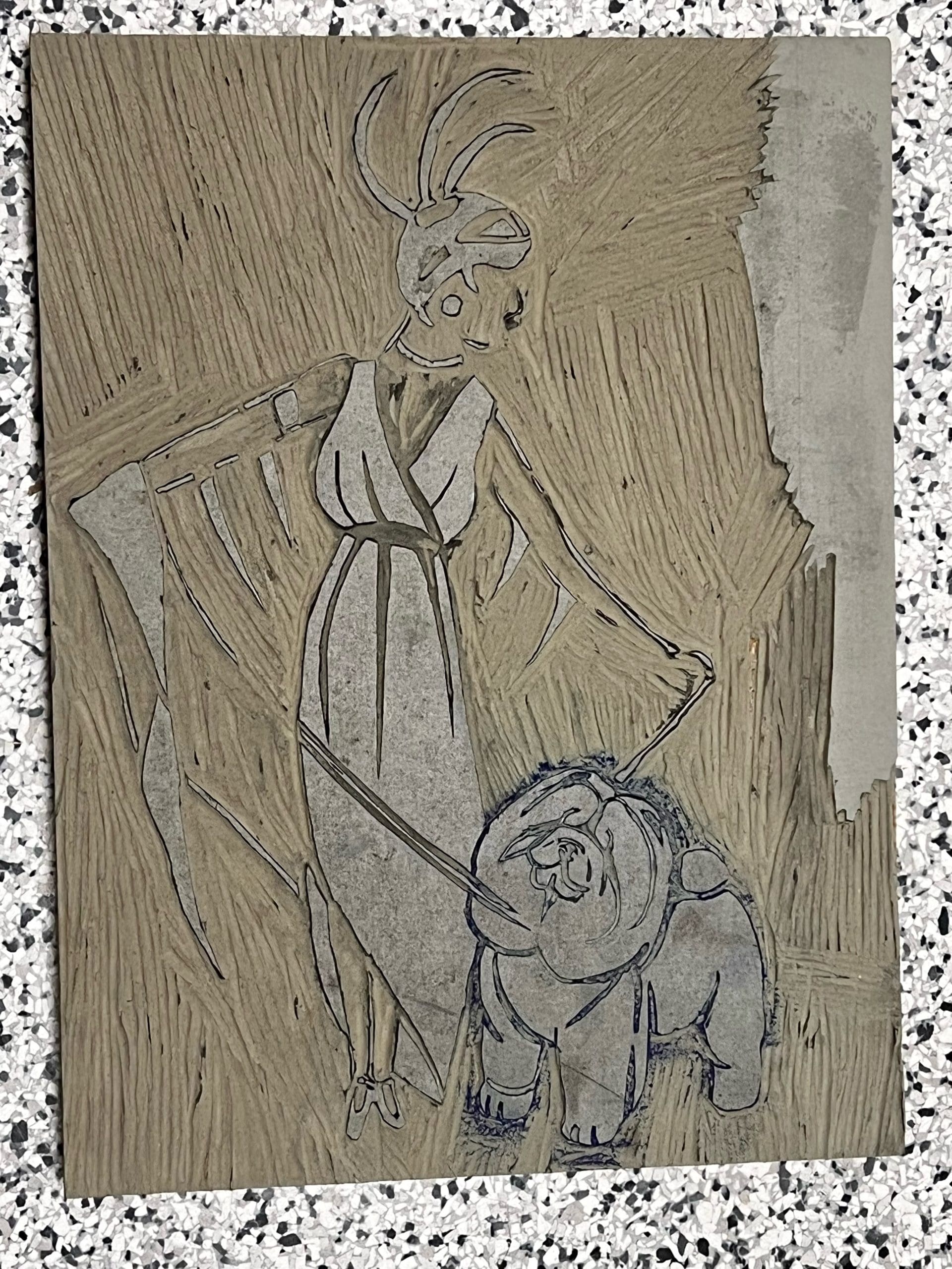 BELOW is the carved linoleum block I created in an art deco style. The block is 11×14 and doesn’t look like much but from it I produced a very small edition of black and white hand pulled prints