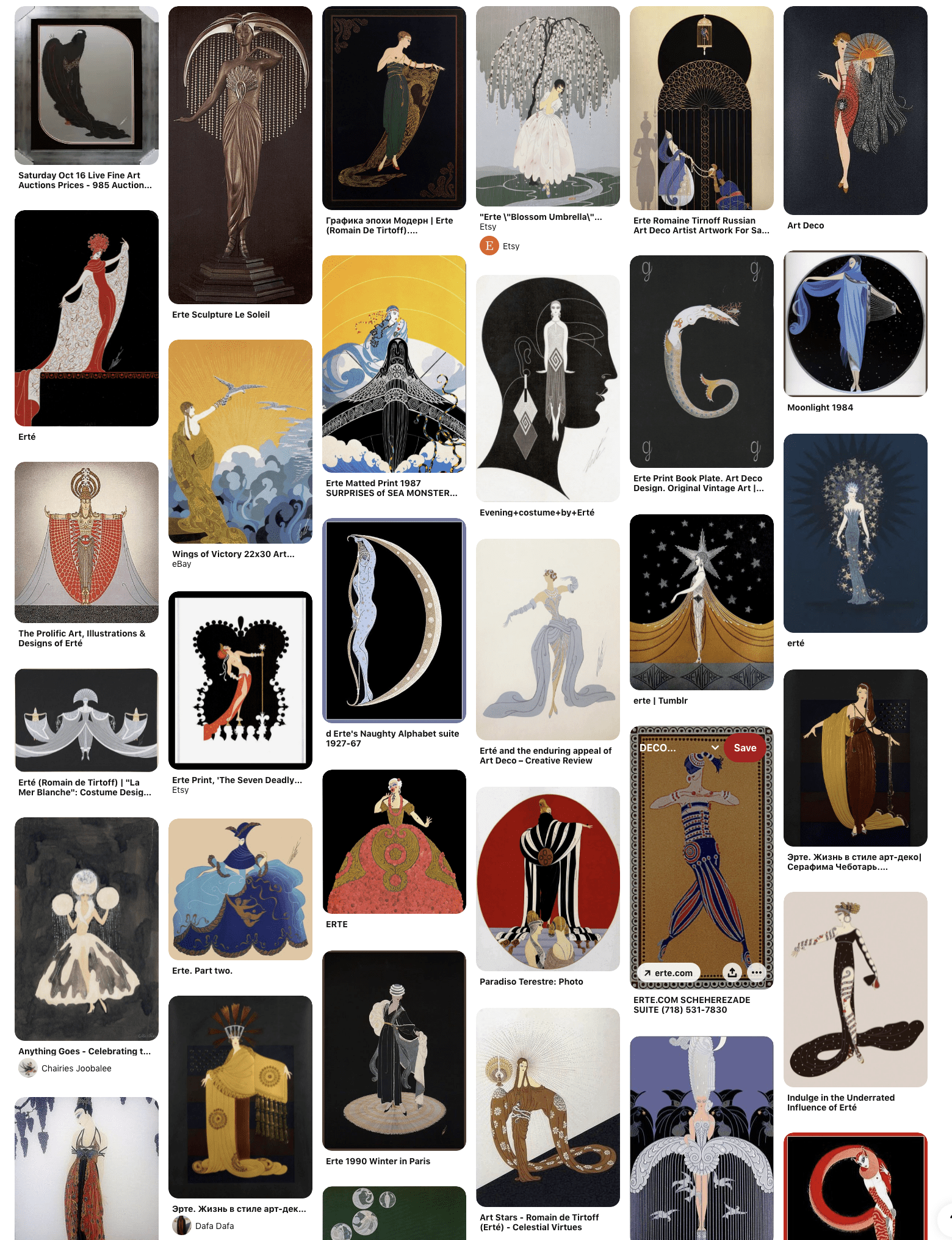 Below find a sampling of Erte’s work from illustration and fashion design to sculpture and magazine covers, which I did a screenshot from a Pinterest search.