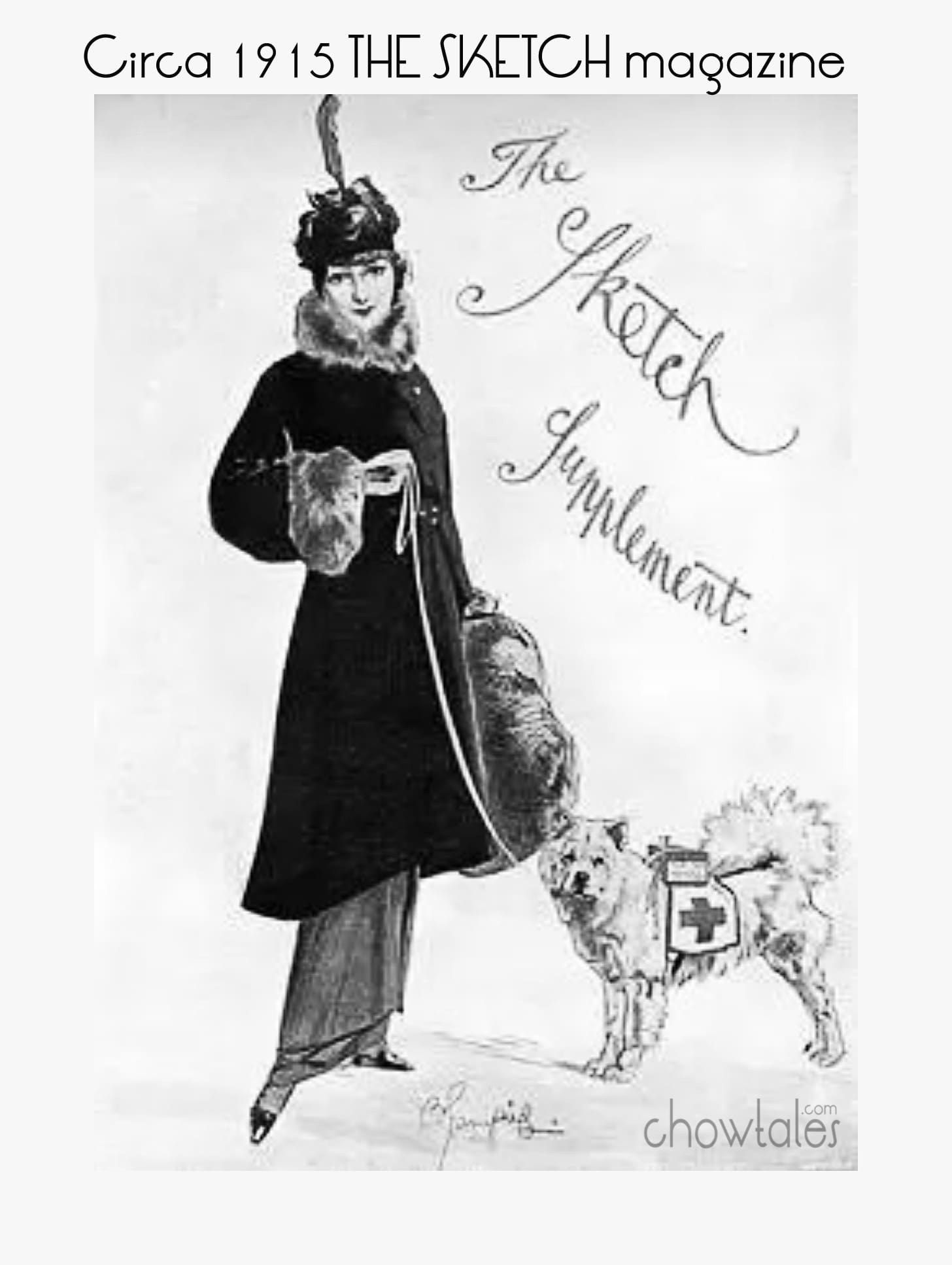 Below, this beautiful magazine cover circa 1915 is from the same year as the photo above. This well known magazine was called THE SKETCH and is from England. This was a “supplement” to the magazine highlighting the Red Cross efforts during WWI. How I would love to get a hold of an original copy of this issue for the ChowTales Archive and to read what is inside relating to this beautiful etching of a Red Cross nurse with a chow. Was a chow used as a prop because of the magazine cover, or could it be that the artist was inspired by the chow with the nurses and the visit from Eleanor Roosevelt? There may be no connection at all, or something very interesting. Any leads on where I might find an original copy please contact this admin!
