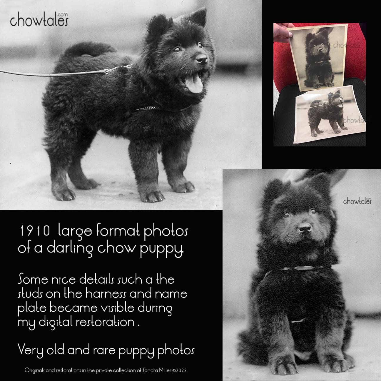 Yesterday I worked on restoring these 112 year old, Cira 1910 large format photos. This is so early in western chow history it makes me ponder was this puppy from England or a Chinese import. Very unusual to have such professional and large photos of a chow…..and a puppy no less