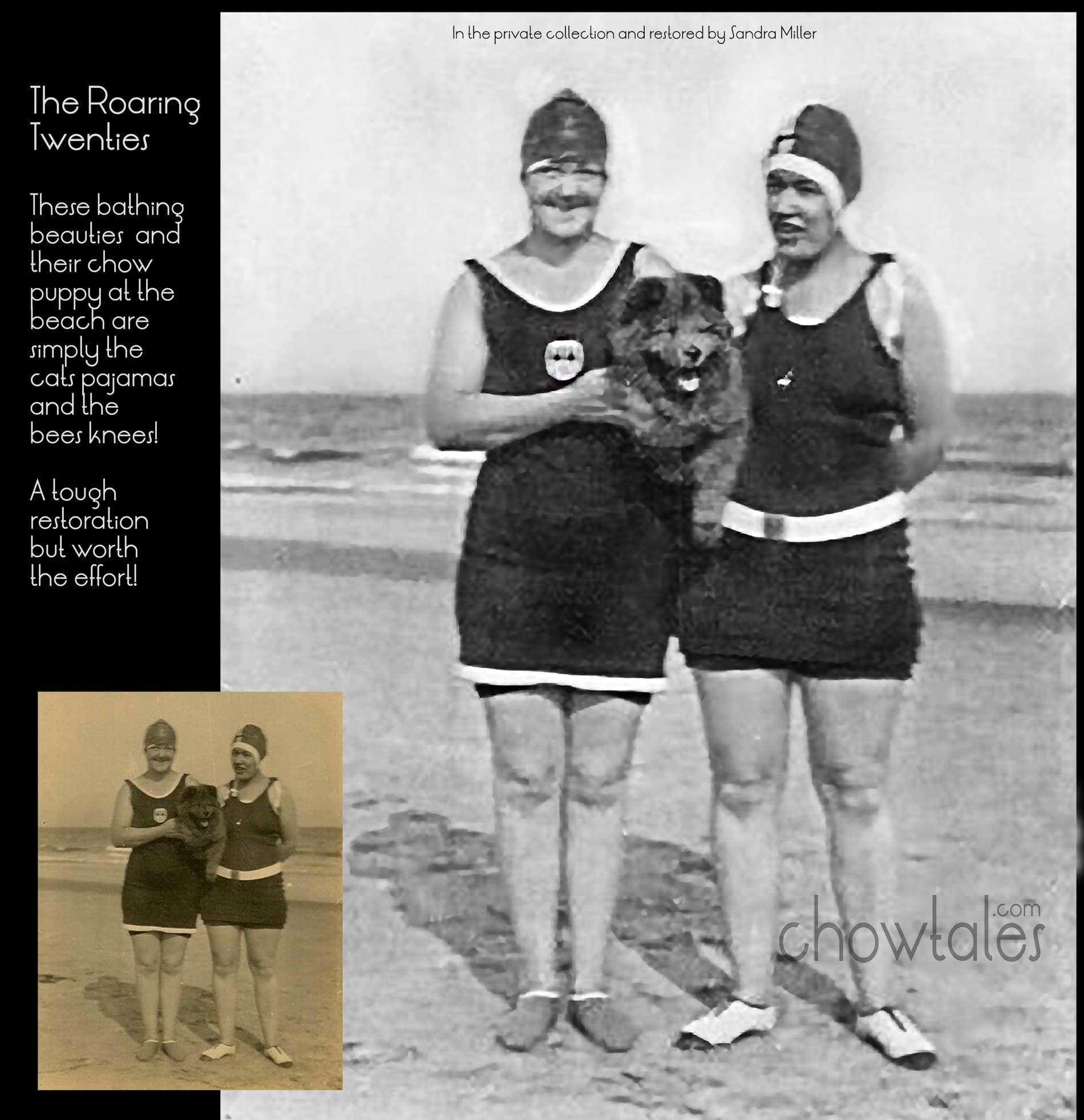This wonderful photo was very blurry,scratched grainy and sepia toned/dark, but how was I supposed to pass this treasure up! I almost passed it by, not noticing there was a chow in the photo at first glance! This image is the EPITOME of the Roaring Twenties….from the two women dressed in typical seaside fashion (check out those beach shoes and bathing caps) to the Chow which was considered the “ultimate accessory” in the heyday of the 1920’s into the 30’s. These women and their pup are the BEES KNEES, THE SNAKES HIPS, and THE CATS PAJAMAS in this writers’ Roaring Twenties opinion.