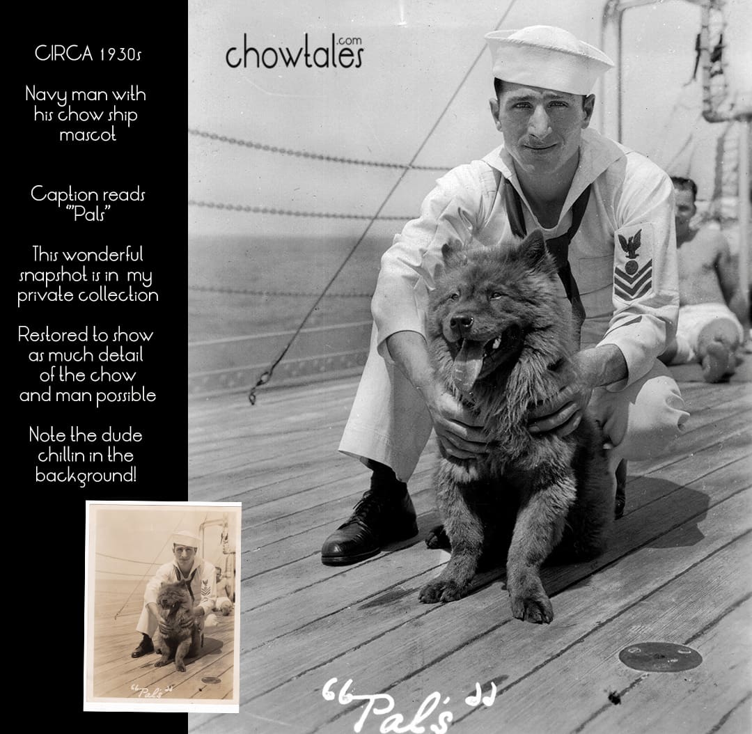 RESTORATION- Circa 1930 Navy man with the ship’s mascot chow. I simply had to have this snapshot and was so happy to find it in very good condition for its’ age. The details really popped forward when I did some work on contrast and converted it to black and white. I love the text “Pals” written on the photo.