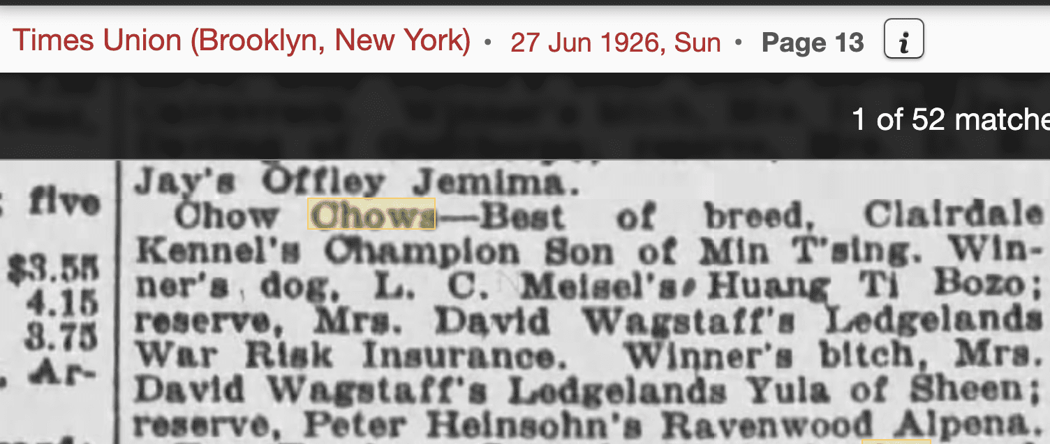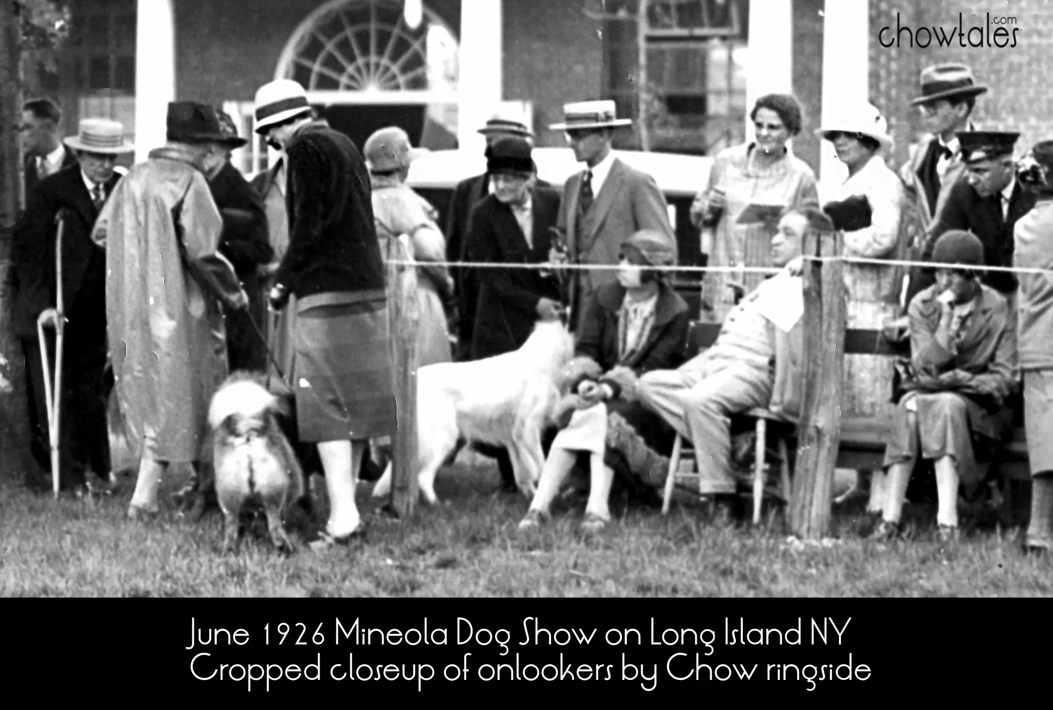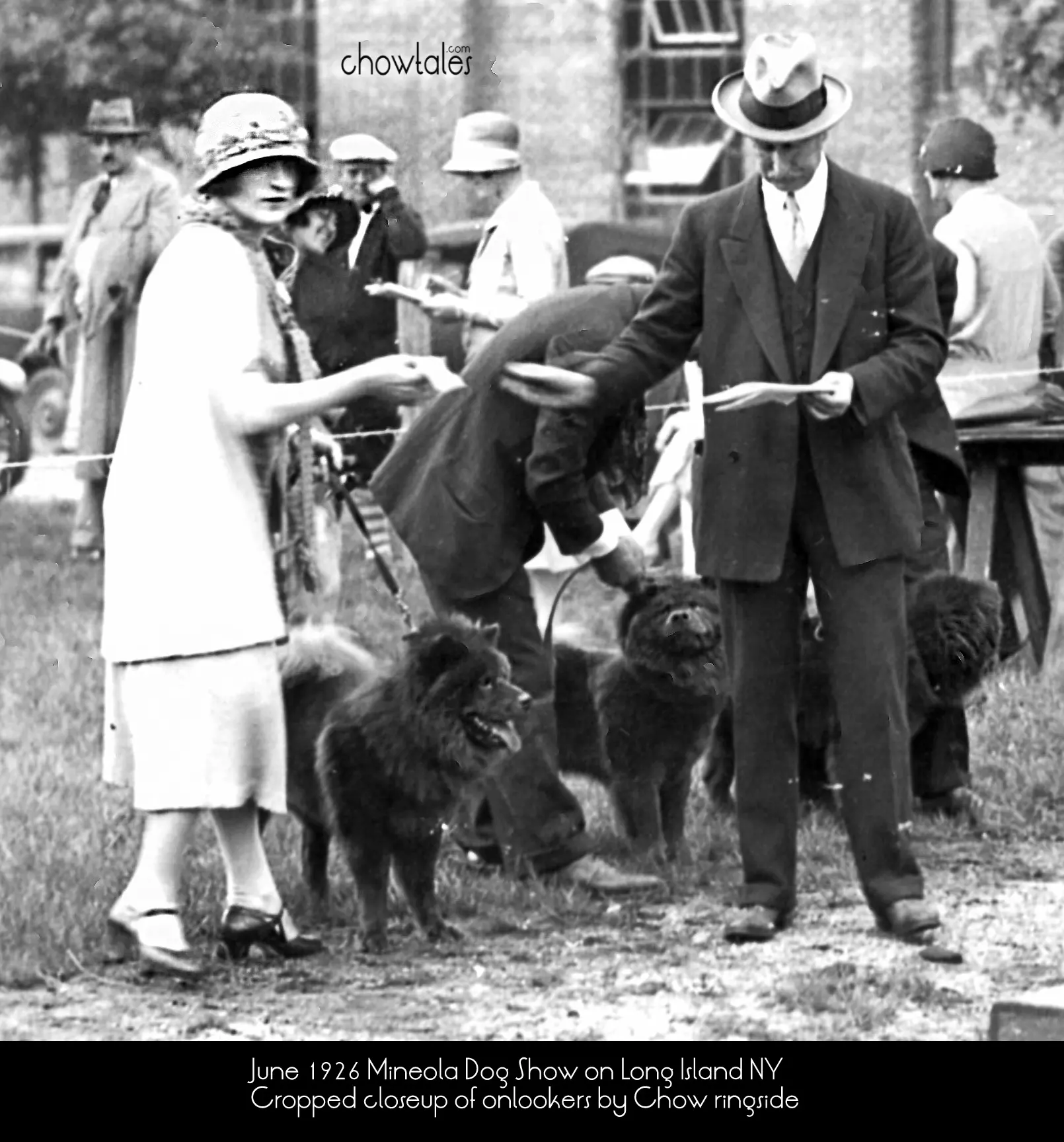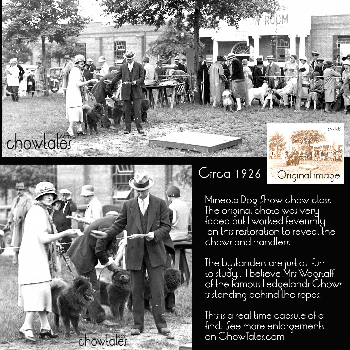 Let me whisk you back in time to the Mineola Dog show , June 1926. A rare Chow time capsule indeed!! To an archivist, there is nothing quite so heartpounding as taking a faded moment in time, and bringing it to life through restoration. I felt a bit like Marty McFly in the movie Back to the Future when his family reappeared back into existance on the snapshot he was carrying. What was barely a hint of a dog show scene with “possible” chows in it, emerged through my Photoshop restoration as people and dogs I recognized!! You can almost feel the energy and hear the voices the photo came up so clear!